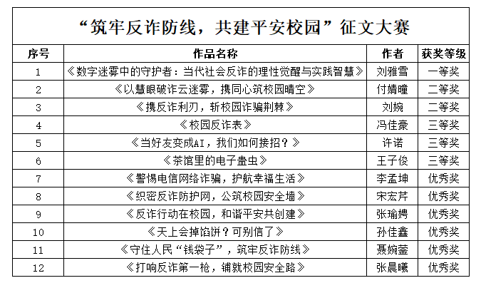 大赛启动的消息一经传出,同学们纷纷响应,踊跃投身创作,一篇篇构思精巧、意蕴深刻的反诈征文作品纷至沓来。经过线上的初步筛选,凭借着扎实的文字功底、独特的叙事视角和对反诈主题的精准把握,12名同学从众多参赛者中崭露头角,成功闯入最终的角逐。